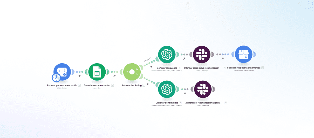 - Si tiene 4 o 5 estrellas, pasa por ChatGPT, que genera una respuesta con nuestras directrices, nos envía un aviso (Slack, WhatsApp, correo) al canal que elijamos y publica la respuesta en Google.